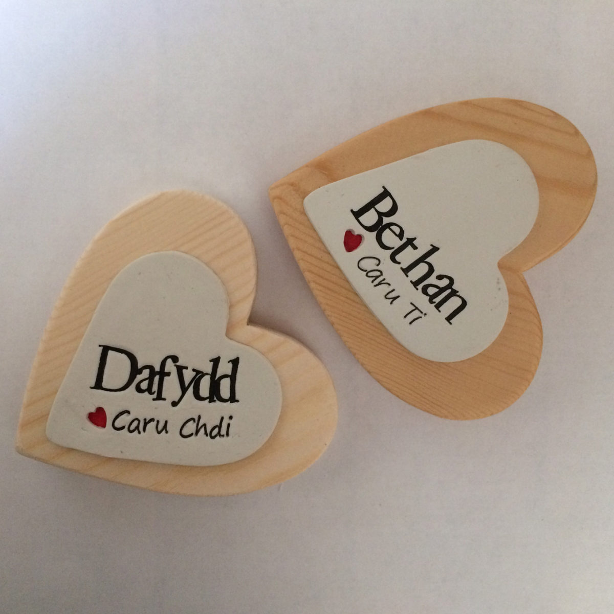 Calon Caru ti pren wedi ei addurno gyda clai polymor gwyn gyda enw arno a calonau lliw i orffen.