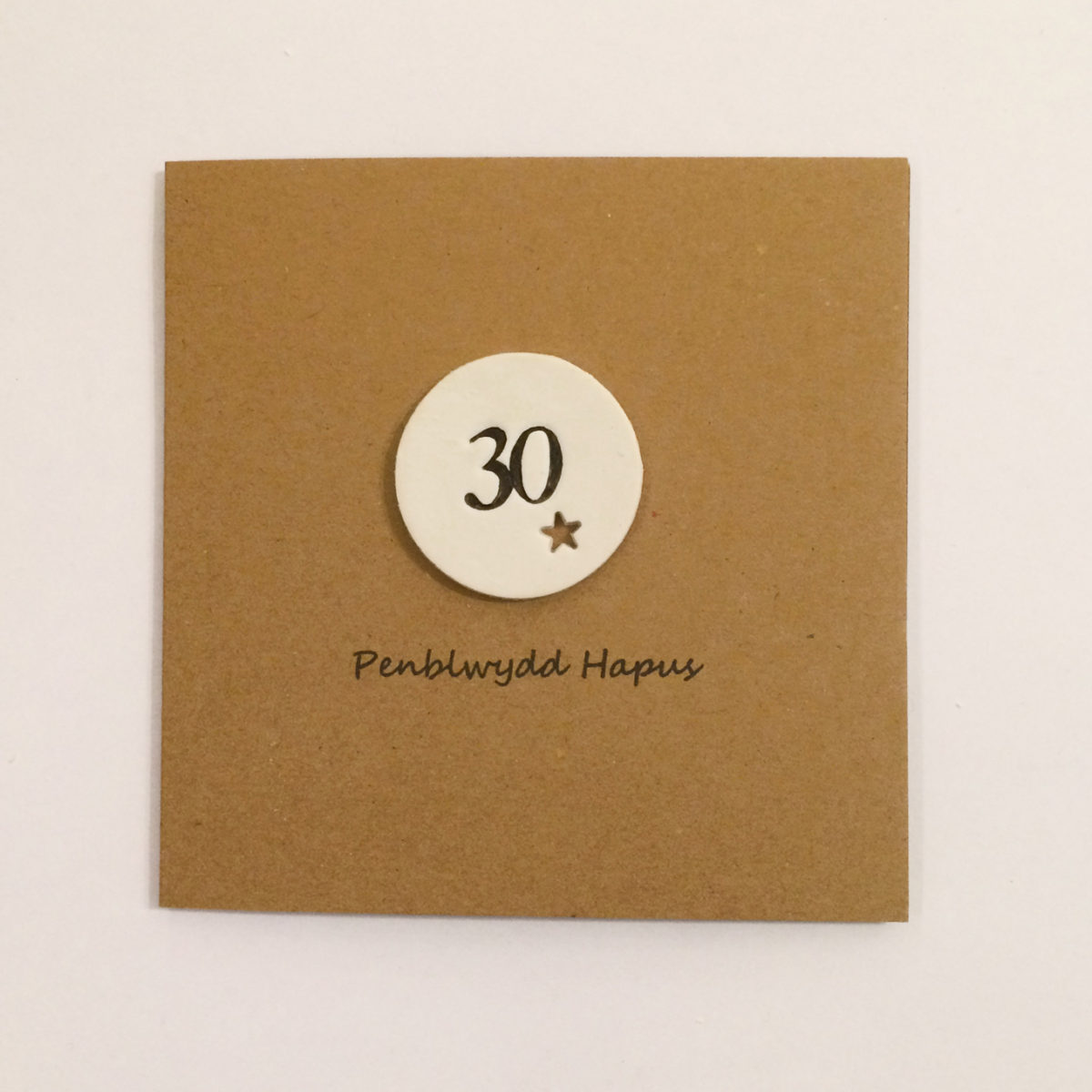 Cerdyn wedi’i wneud â llaw i ddymuno Penblwydd Hapus 30 oed. Cylch o Glai Polymor Gwyn gyda print penblwydd hapus i orffen. Gwag tu mewn.