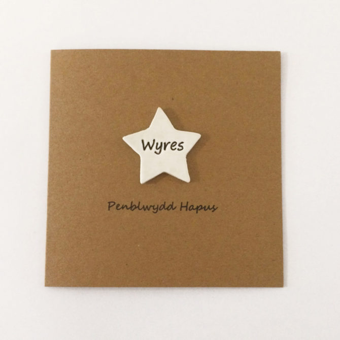 Welsh birthday card with the words ‘Happy birthday Niece’ in Welsh – Penblwydd hapus Wyres. Star shaped polymor clay with Penblwydd Hapus print to finish. Blank inside.